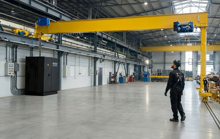 La gru a cavalletto zoppo, in configurazione monotrave o bitrave, rappresenta una soluzione efficace per le aree operative poste al di sotto di grandi sistemi di carriponte. Robusta e versatile, consente di liberare spazio al suolo e di tutelare la sicurezza degli operatori.